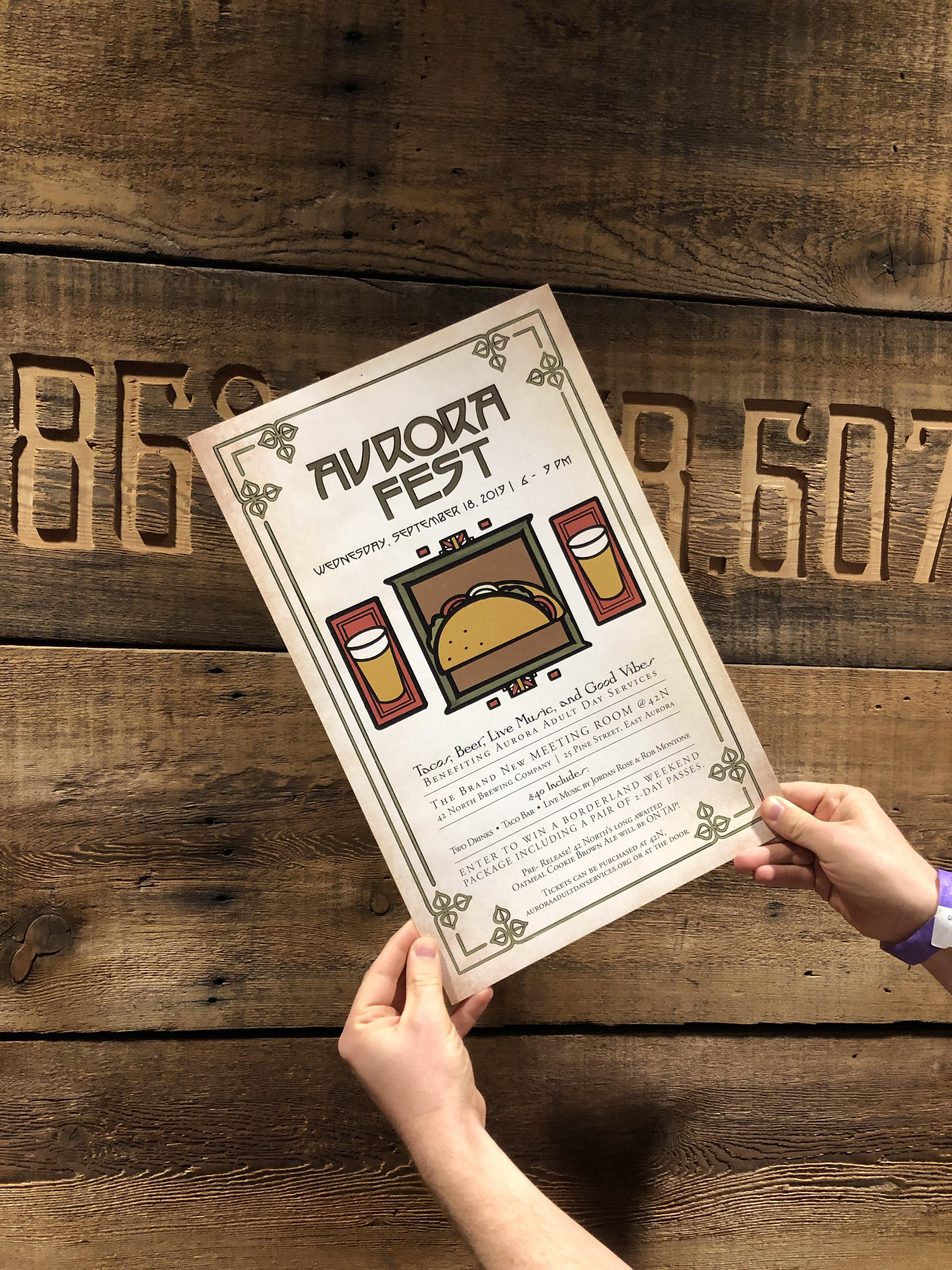 Poster for Aurora Fest, a fundraiser for Aurora Adult Day Services. Roycroft/ arts and crafts styled illustrations. Created in collaboration with Riveter Design.